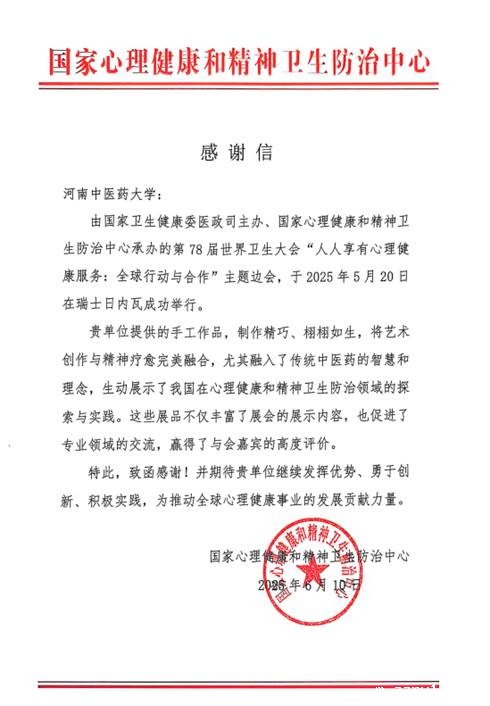 本网讯(文/图 刘俊岐)近日,我校收到国家心理健康和精神卫生防治中心发来的感谢信,对我校选送的中医药手工作品在第78届世界卫生大会主题边会上的出色展示表示衷心感谢。这是我校在心理健康教育与中医药文化国际传播领域的一次重要展示。